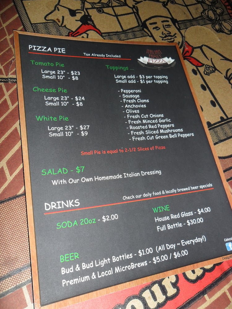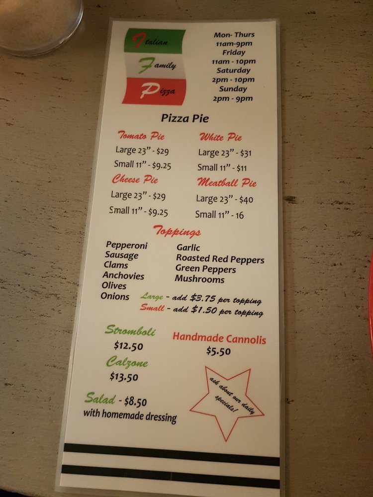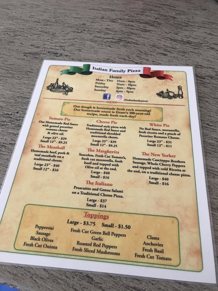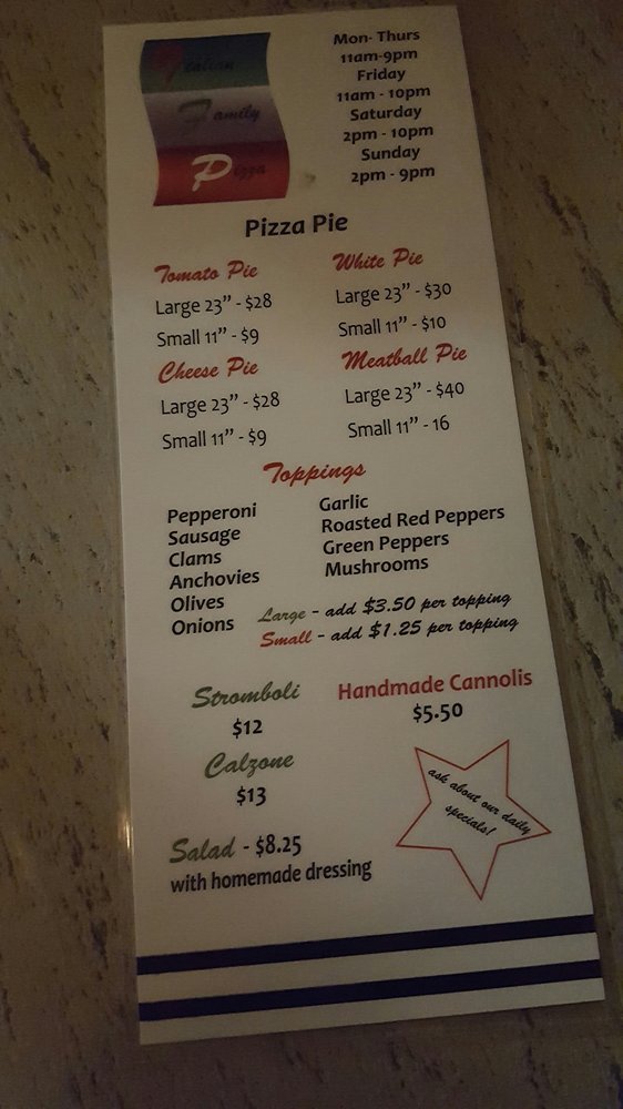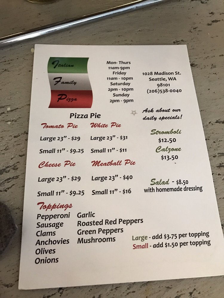 Introducing the menu at Italian Family Pizza, located in Seattle, WA. This Italian pizza joint offers a variety of options to cater to different preferences, including vegan and vegetarian choices. Customers rave about the perfect thin crust, fresh ingredients, and flavorful pizzas. The garlic knots are a must-try, with generous portions of butter and fresh garlic. The brick oven style pizzas are a standout, reminiscent of NYC-style pizza. The staff is friendly, the service is prompt, and the overall atmosphere is cozy and welcoming. Whether you're in the mood for a classic cheese pizza or a specialty like the New Yorker with sausage and peppers, Italian Family Pizza delivers on taste and quality. Don't forget to top off your meal with some fresh grated Parmesan cheese. A solid spot for a delicious and satisfying pizza experience.